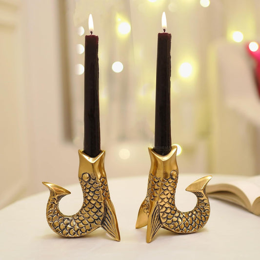 Elegant Antique Gold Fish Figurine Taper Candle Holder Set of 2 | Home Decor Tabletop Living Room Showpiece Gift