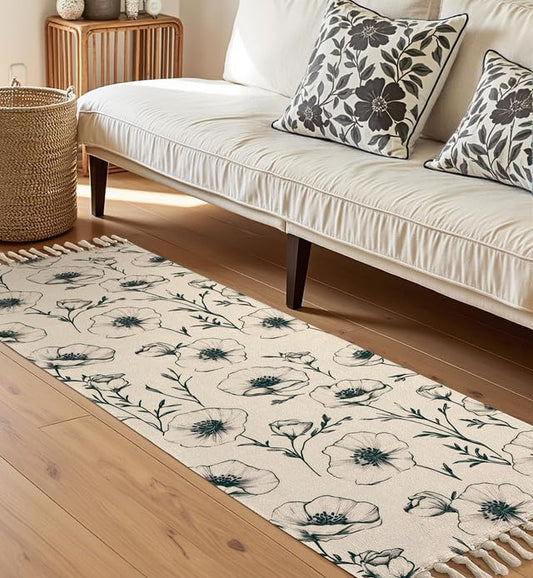 Modern Black Floral Hand Woven 100% Cotton Washable 2x5 ft Bedside Runner Rug | Living Room, Bedroom, Kitchen Carpet
