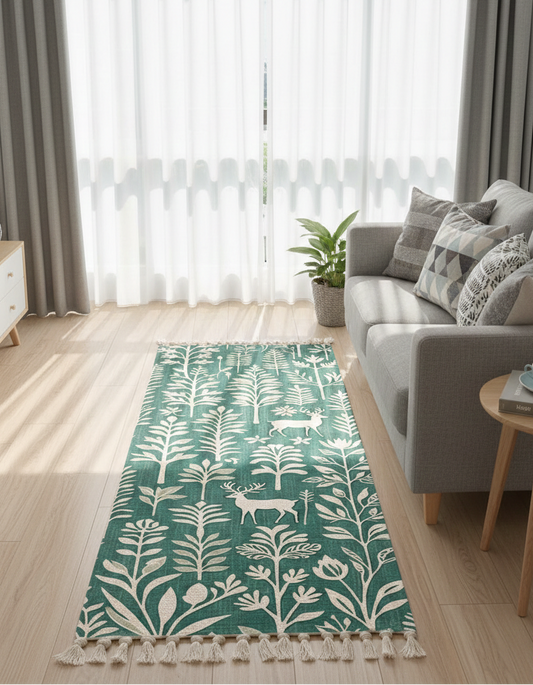 Hand Woven Printed 100% Cotton Washable Bedside Runner Carpet 2x5 Feet | Green Floral Rug for Living Room, Bedroom, Kitchen