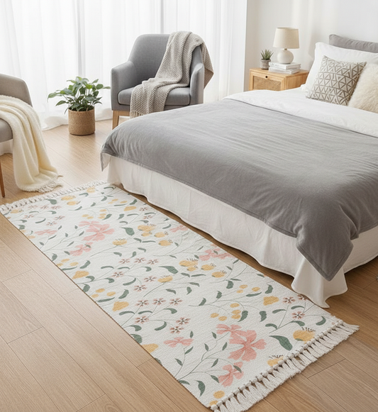 Modern Floral Hand Woven 100% Cotton Washable Bedside Runner 2x5 ft | Living Room, Bedroom, Kitchen Carpet