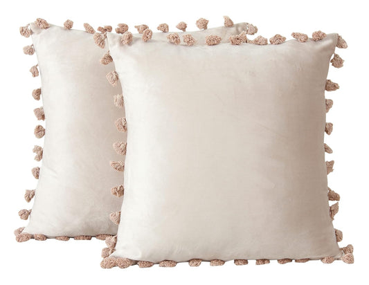 Decorative Velvet Tassel Fringe Throw Pillow Covers 12x12 Inch (2 Pc) | Soft Cushion for Sofa, Living Room, Home Décor