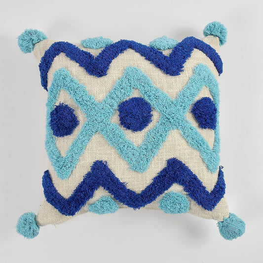 Modern Bohemian Geometric Tufted Throw Pillow Cover, Blue Mix Pom Poms, 16x16 Inch, 1 Piece | Decorative Cushion for Sofa & Home Decor