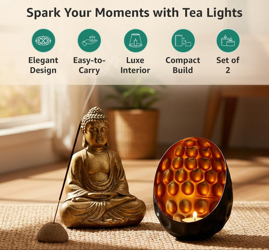 Elegant Oval Diamond Black Iron Gold Handcrafted Tea Light Votive Holders Set of 2 | Candle Holder, Home Decor, Diwali, Christmas