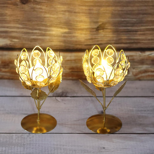 Ornate Gold Crystal Rose Lotus Tea Light Holder Set of 2 | Handcrafted K9 Votive Candle Stand for Home Decor, Diwali, Puja Gifts