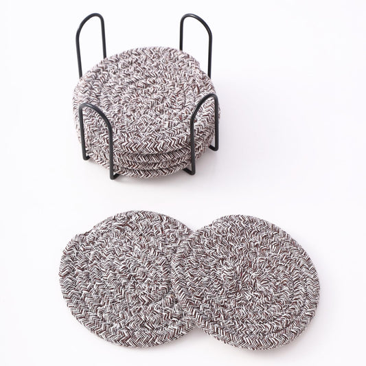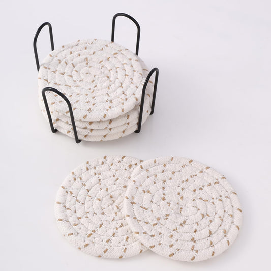 Minimalist Woven Absorbent Cotton Drink Coasters with Holder Set of 6, 4-inch | Home Décor, Tabletop, Bar, Kitchen, Gifts