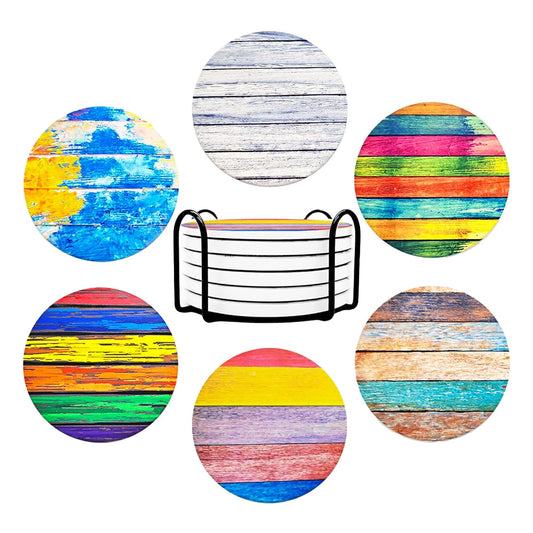 Attractive Multicolor Ceramic Drink Coaster Set of 6 with Cork Steel Holder | Water Absorbent for Cups, Mugs, Glasses, Home, Office
