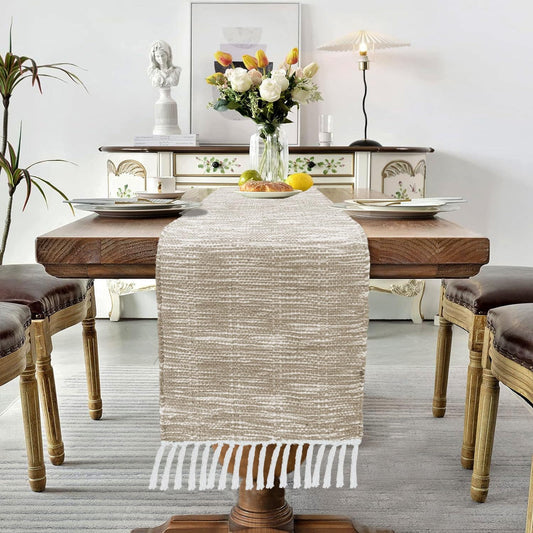Elegant Beige White Woven Table Runner with Tassels, Cotton Jute 13x74 Inch | Dining Table Decor, Home Kitchen