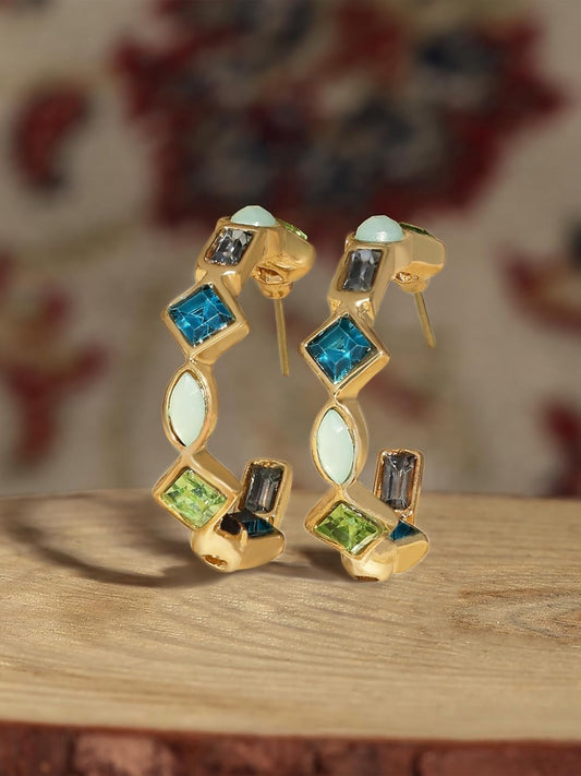 Green Blue Dazzling Stones Semi Hoop Studs – Contemporary Earrings – Embellished Jewellery Pair