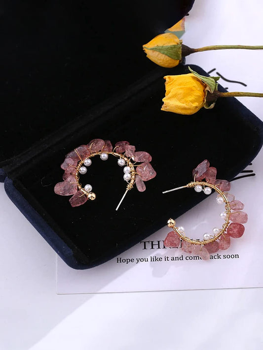 Stone Studded Hoop Earrings – Clip-On Earrings – Gold Tone Pink & White Stones – Pair