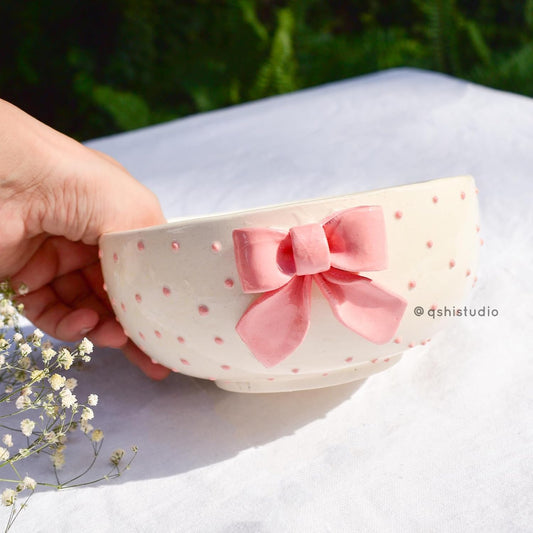 Ceramic Breakfast Bowl – Pink Bow Design – Handcrafted Pottery – 450 ml