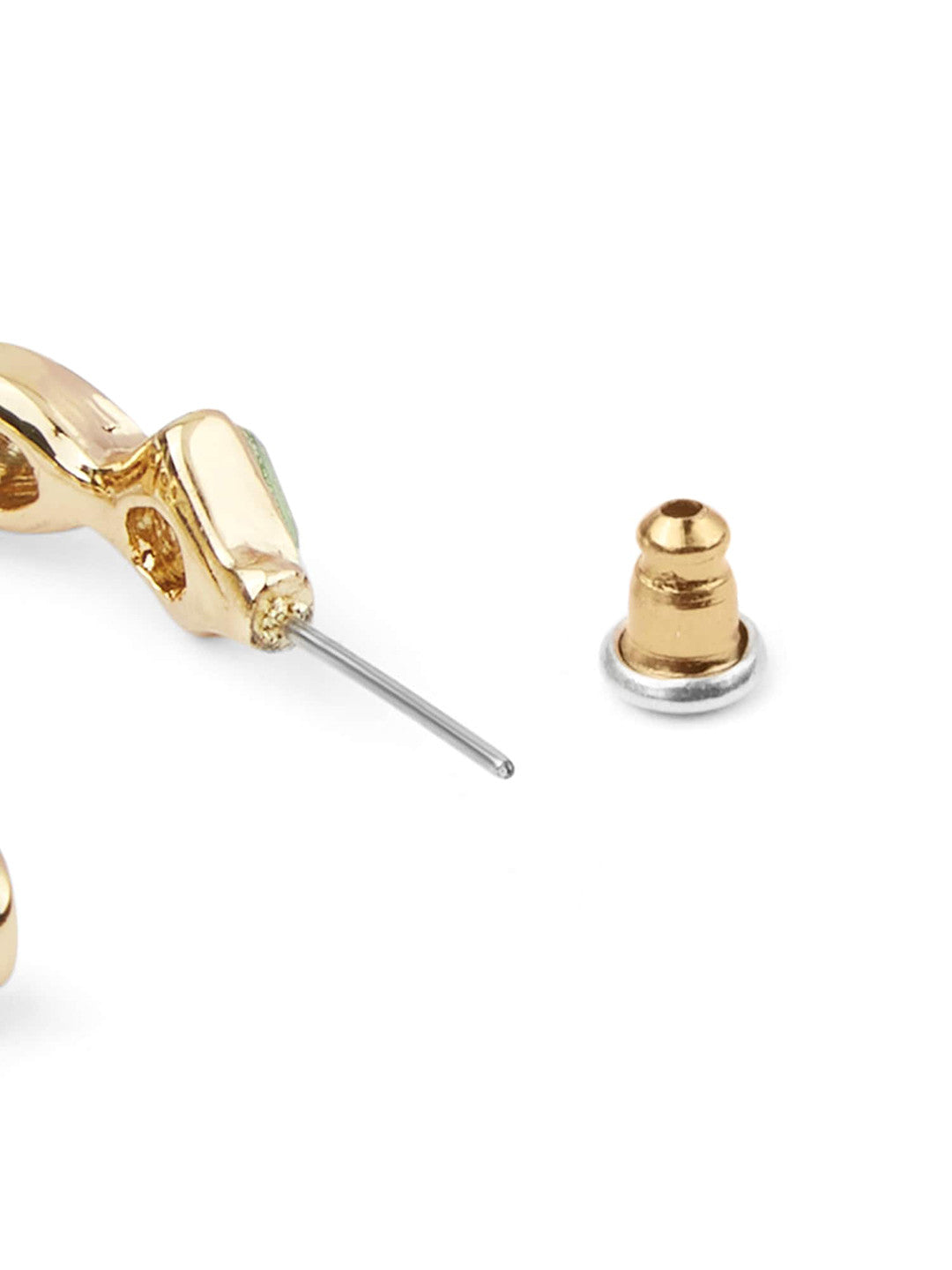 Presenting a distinctive line of circular half hoop earrings designed for contemporary retail assortments. These pieces feature a gold-toned finish complemented by blue and green artificial stones, offering a unique aesthetic for diverse customer preferences.