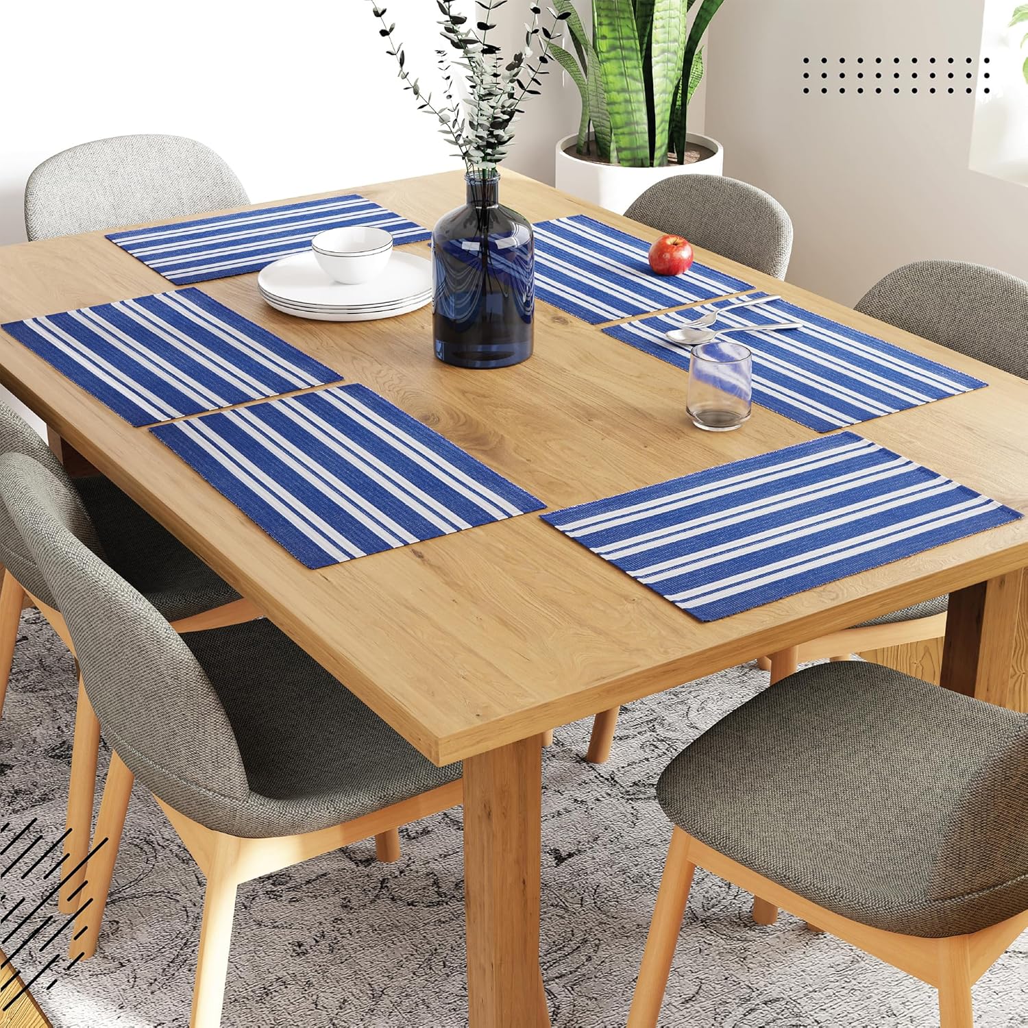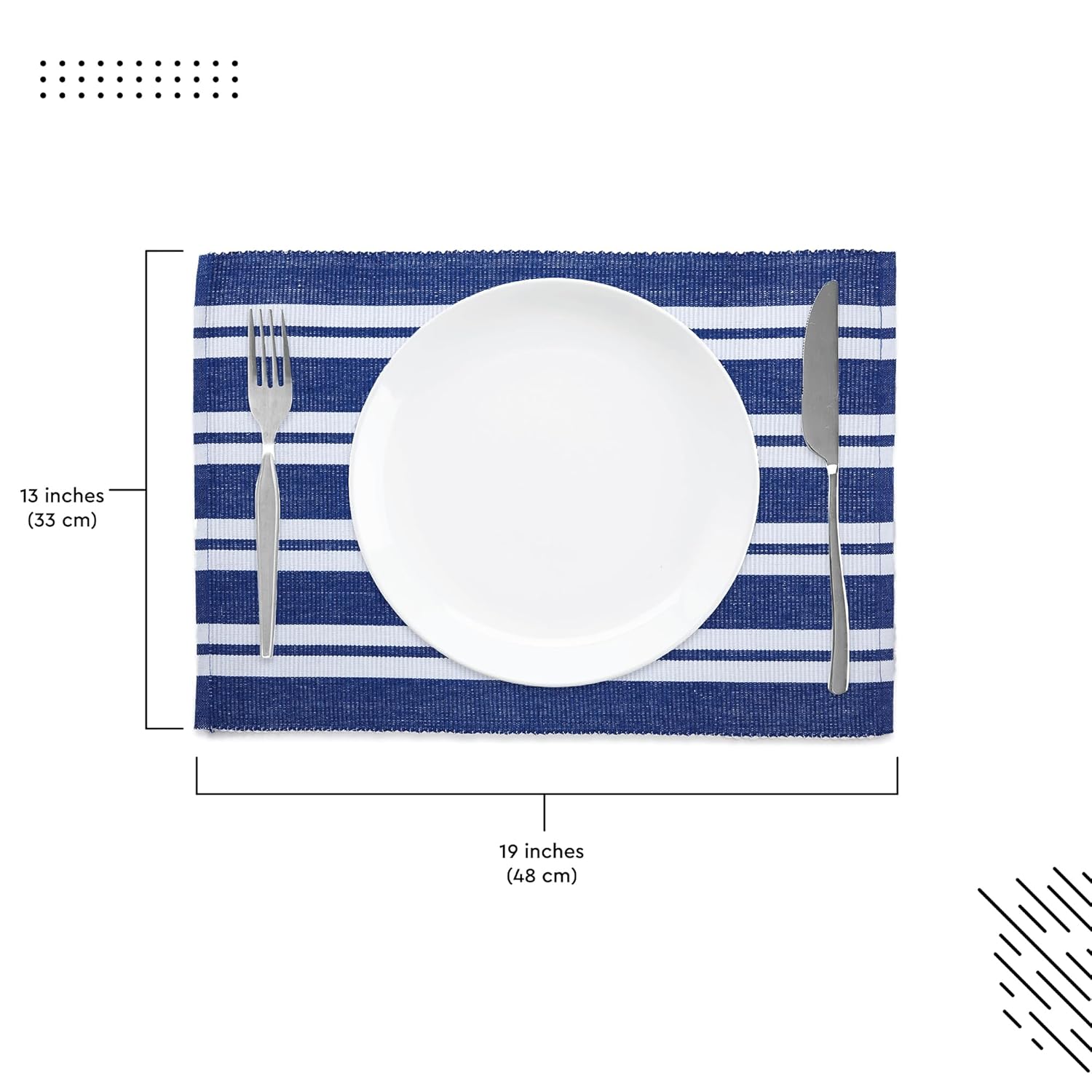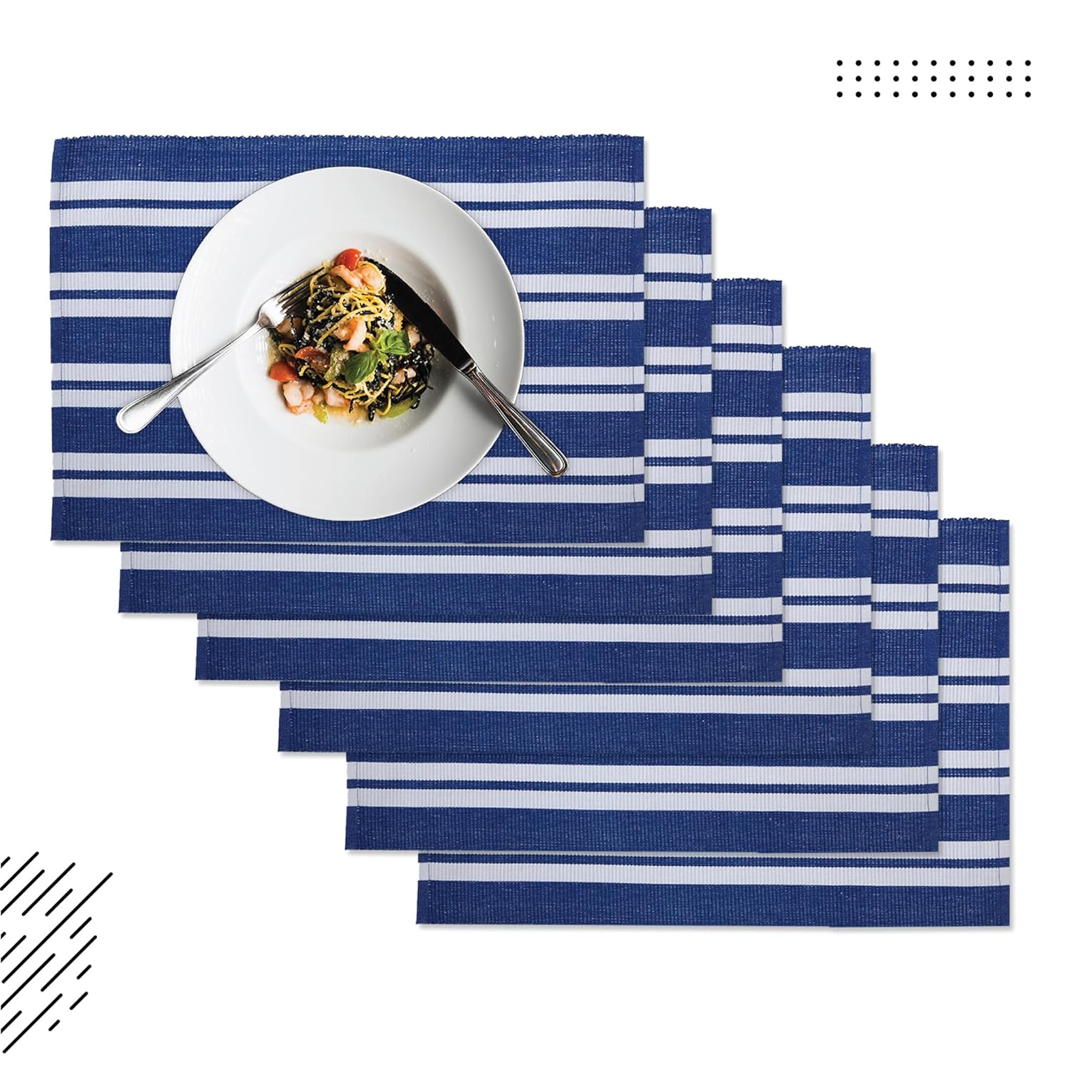 Franca Blue Stripes Ribbed Cotton Dining Table Mats Set of 6, 48x32 cm | Heat-Resistant Washable Placemats