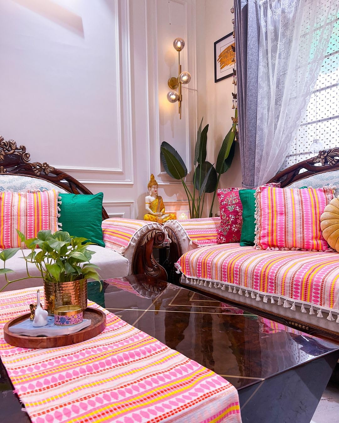 - Effortless Care: Maintain the pristine look of your covers with ease. Simply machine wash cold, dry in shade, and avoid bleaching or tumble drying to preserve their quality and vibrant geometric pink design.