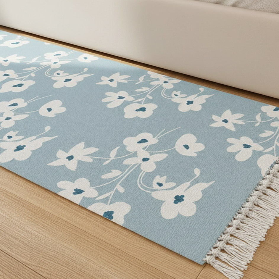 Hand Woven 100% Cotton Washable Gardenia Print Bedside Runner 2x5 ft | Carpet for Living Room, Bedroom, Kitchen