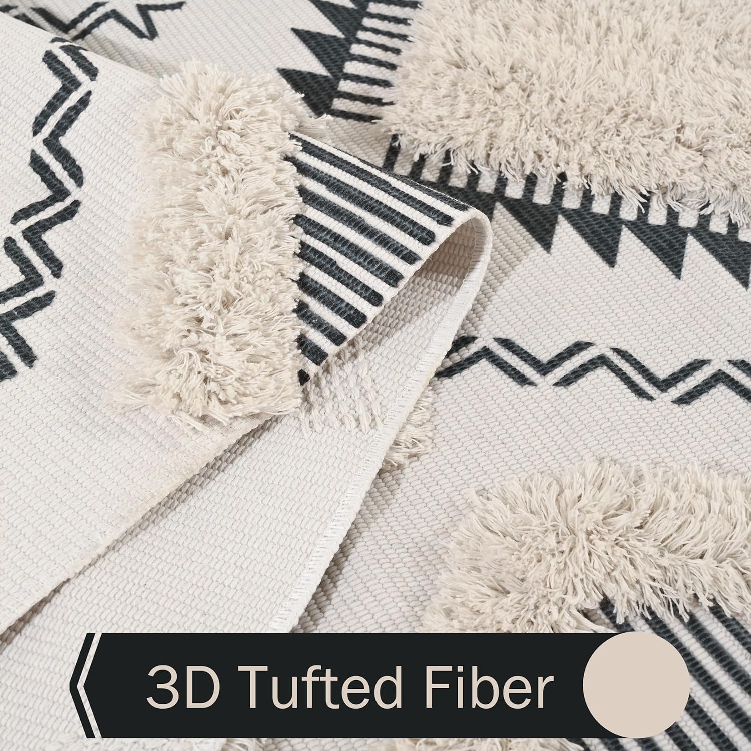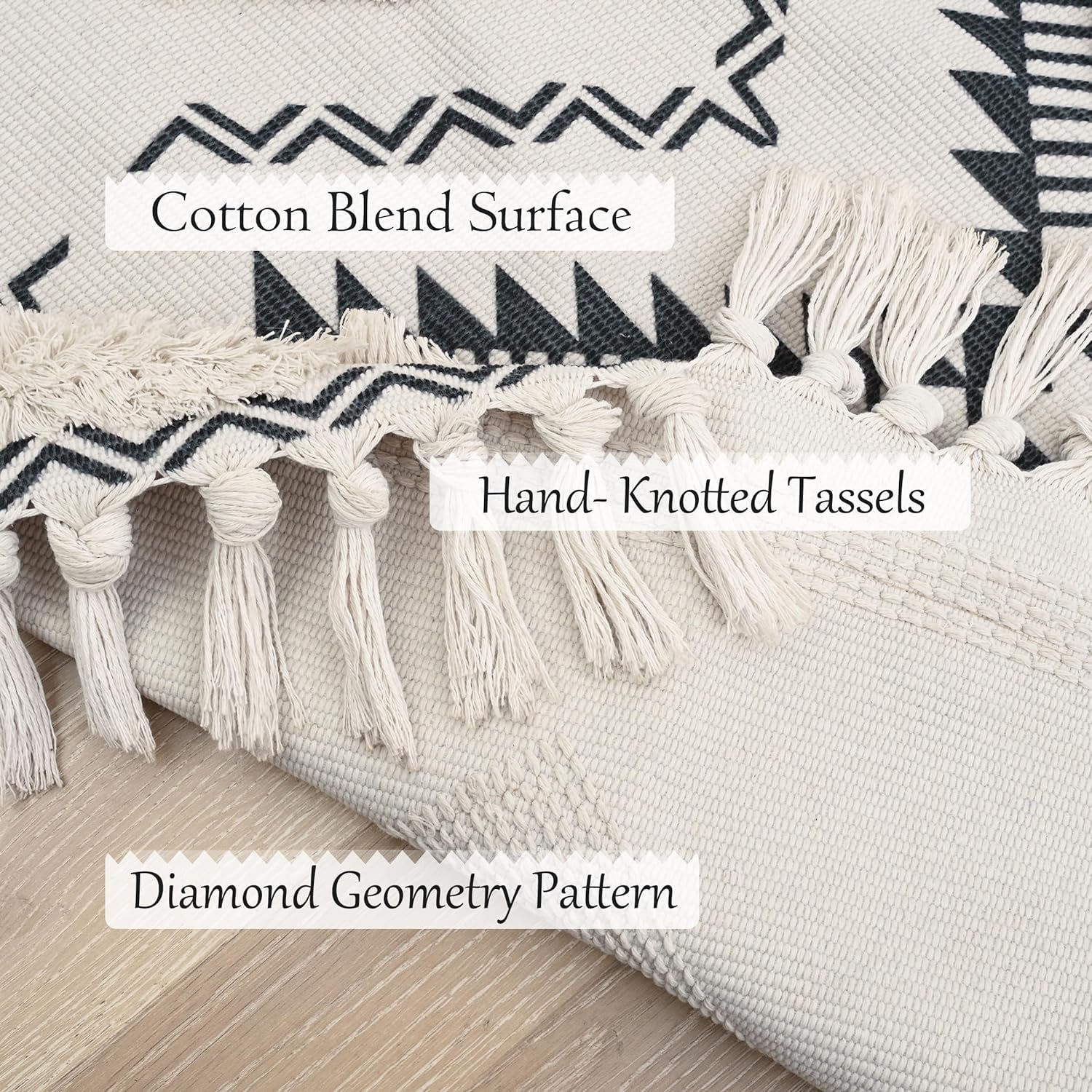 Hand Woven Tufted Modern 100% Cotton White & Black Area Rug Runner 2x5 ft | Bedroom Living Room Floor Decor Carpet