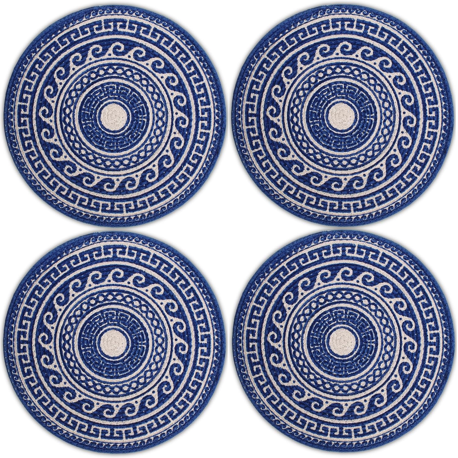 Handmade Ribbed Blue Mandala Round Table Mats Set of 4 (32cm) | Heat-Resistant, Washable Cotton Dining Placemats