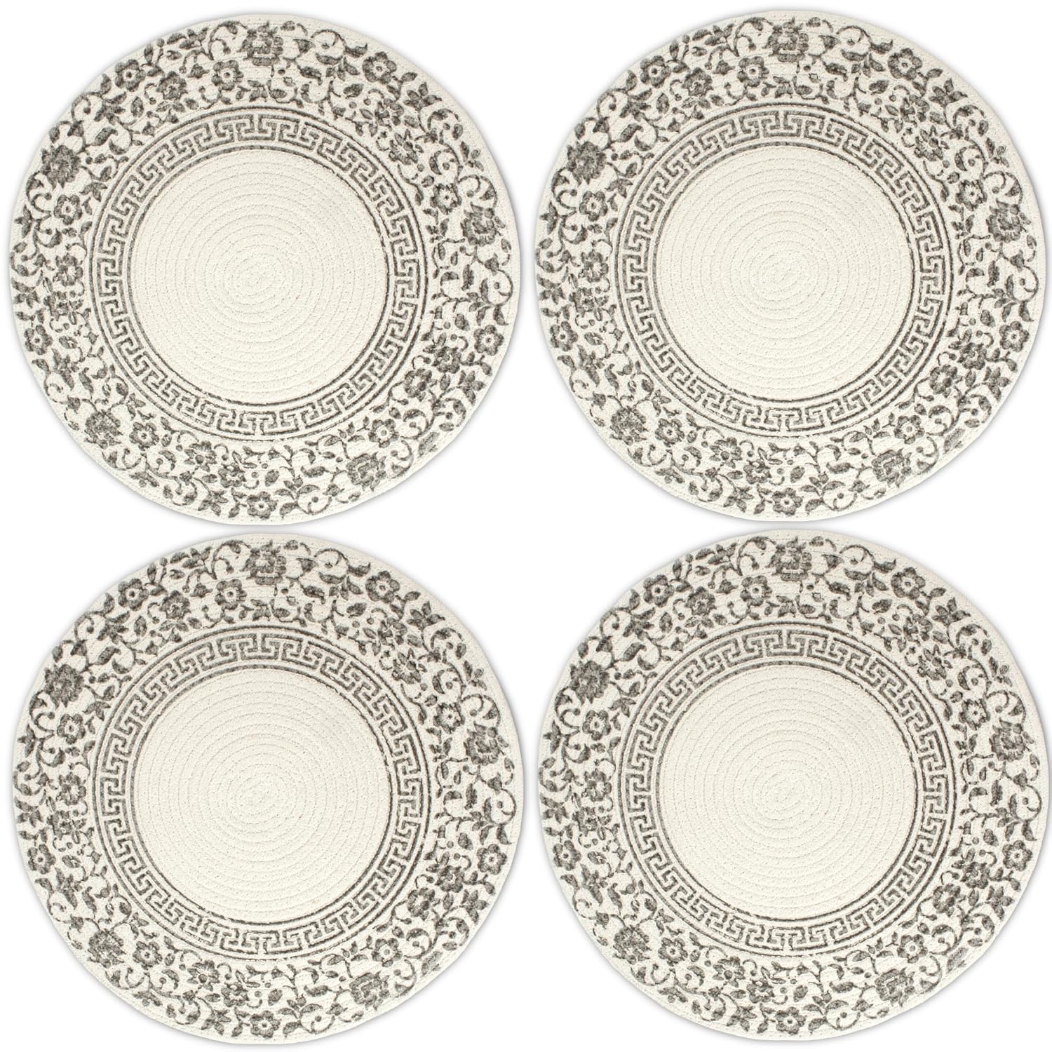 Handmade Ribbed Printed Grey Round Table Mats Set of 4 | Heat-Resistant, Washable Placemats for Dining