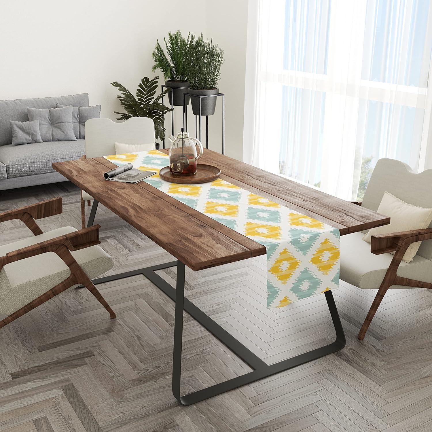 Ikat Yellow Teal Printed Poly Cotton Table & Bed Runner (13x60 In) | Modern Washable Home Decor Dining Living