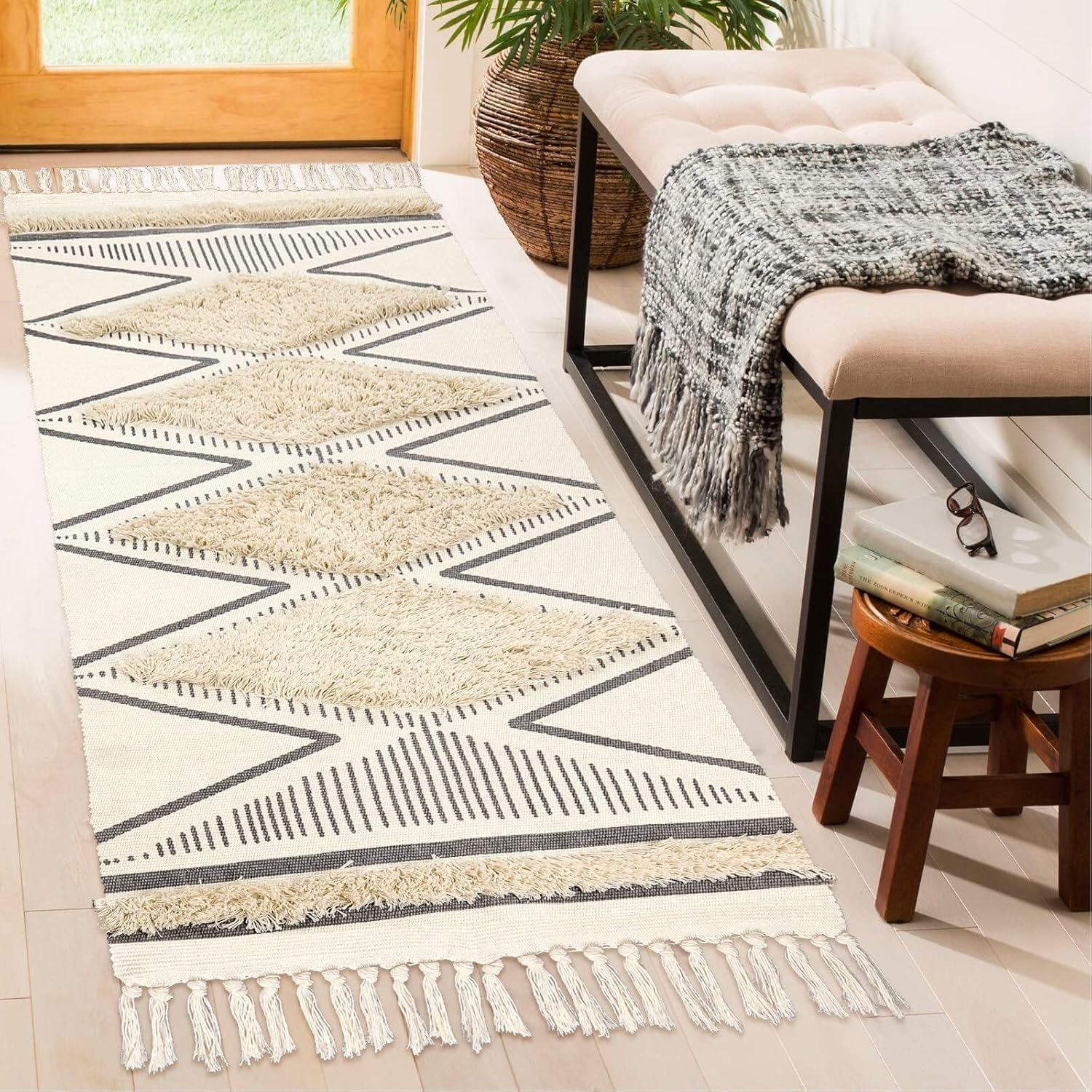 Modern Hand Woven 100% Cotton Designer Rug, 2x5 ft (White Triangle) | Washable Bedroom Living Room Floor Runner