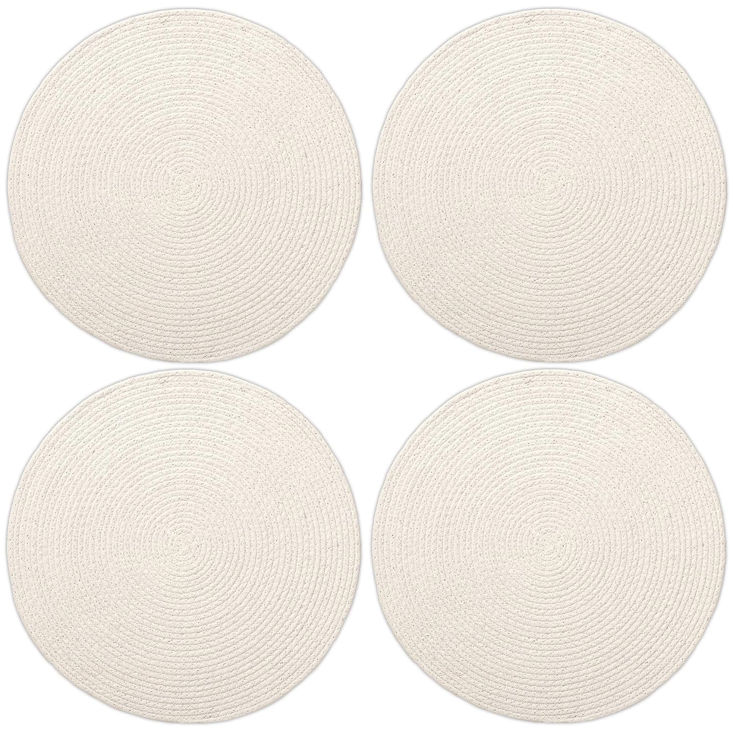 Off White Ribbed Heat-Resistant Washable Cotton Table Mats Set of 4, 32cm Round | Dining Placemats, Non-Slip Tablemate