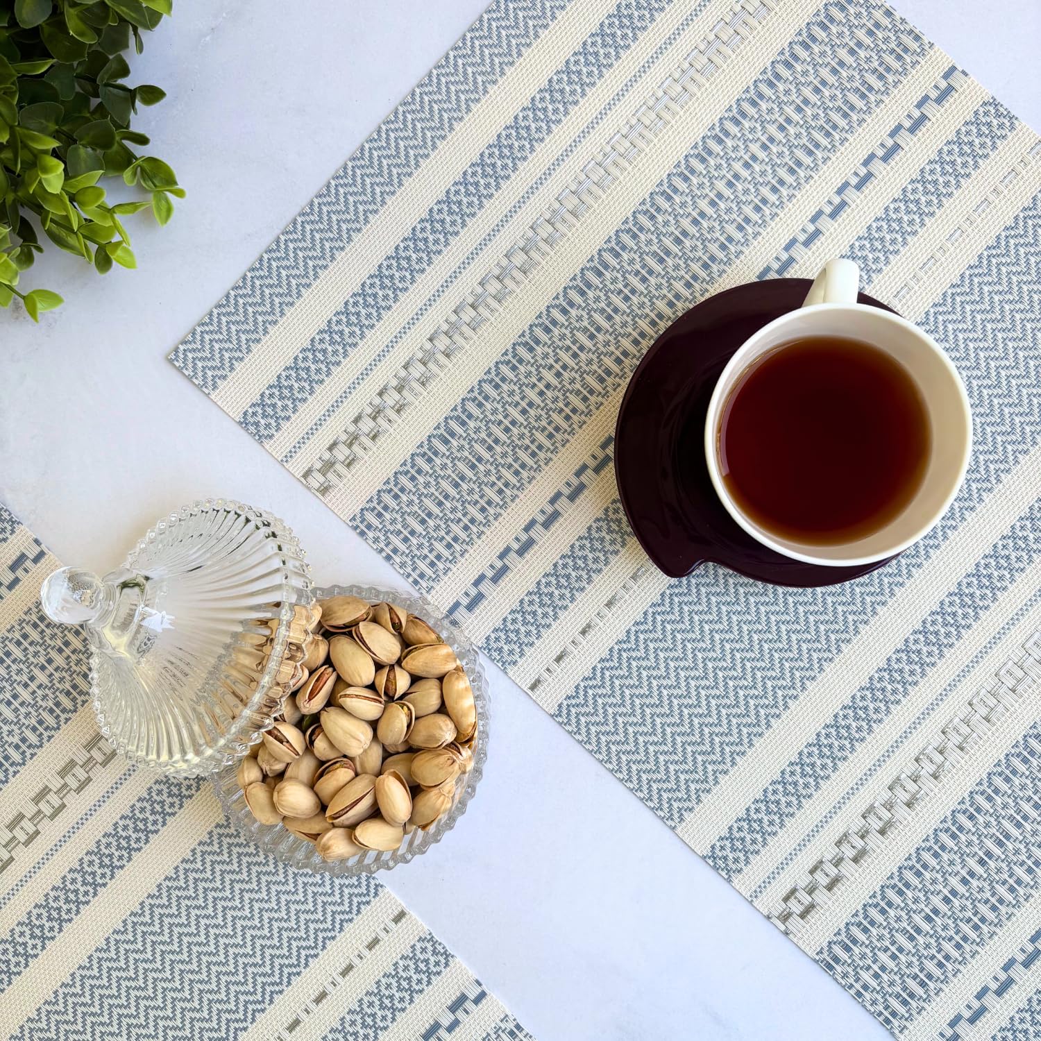 Crafted from high-quality woven PVC (vinyl), these placemats feature an elegant Blue & white unique weaving pattern, adding a sophisticated touch to any dining setting. -