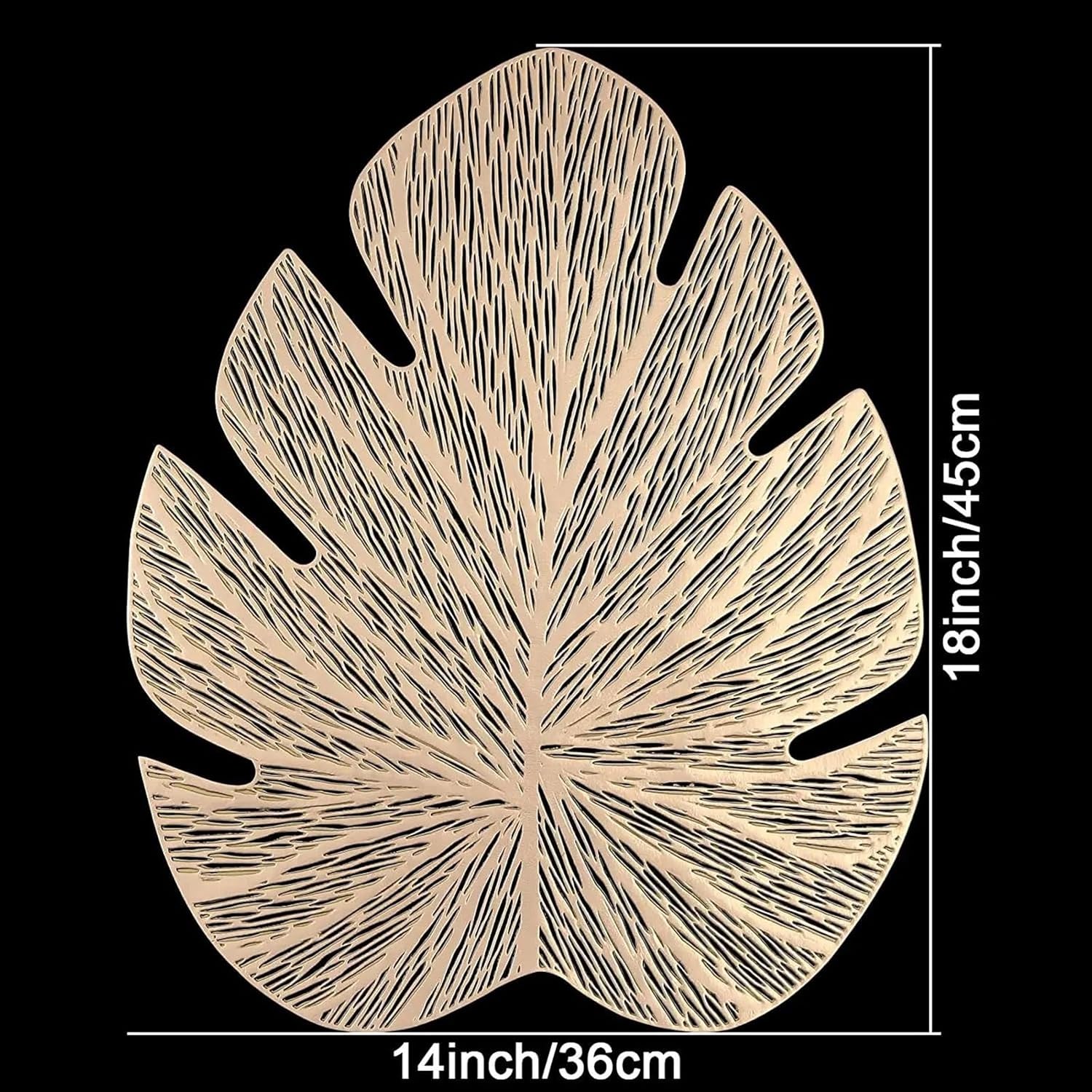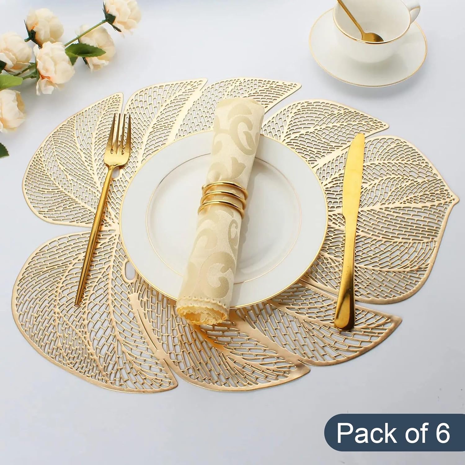 Stylish Leaf Non-Slip Heat Resistant Placemats Pack of 6 (45x36 cm) | Wipeable PVC Golden Dining Table Mats