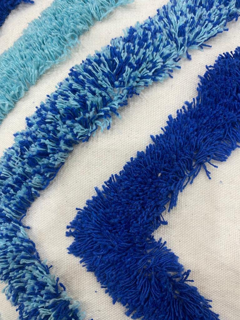 - Material: Crafted from a soft, durable fabric blend, featuring a textured tufted surface with geometric patterns in navy blue, light blue, and beige. Adorned with playful light blue pom-pom trim.